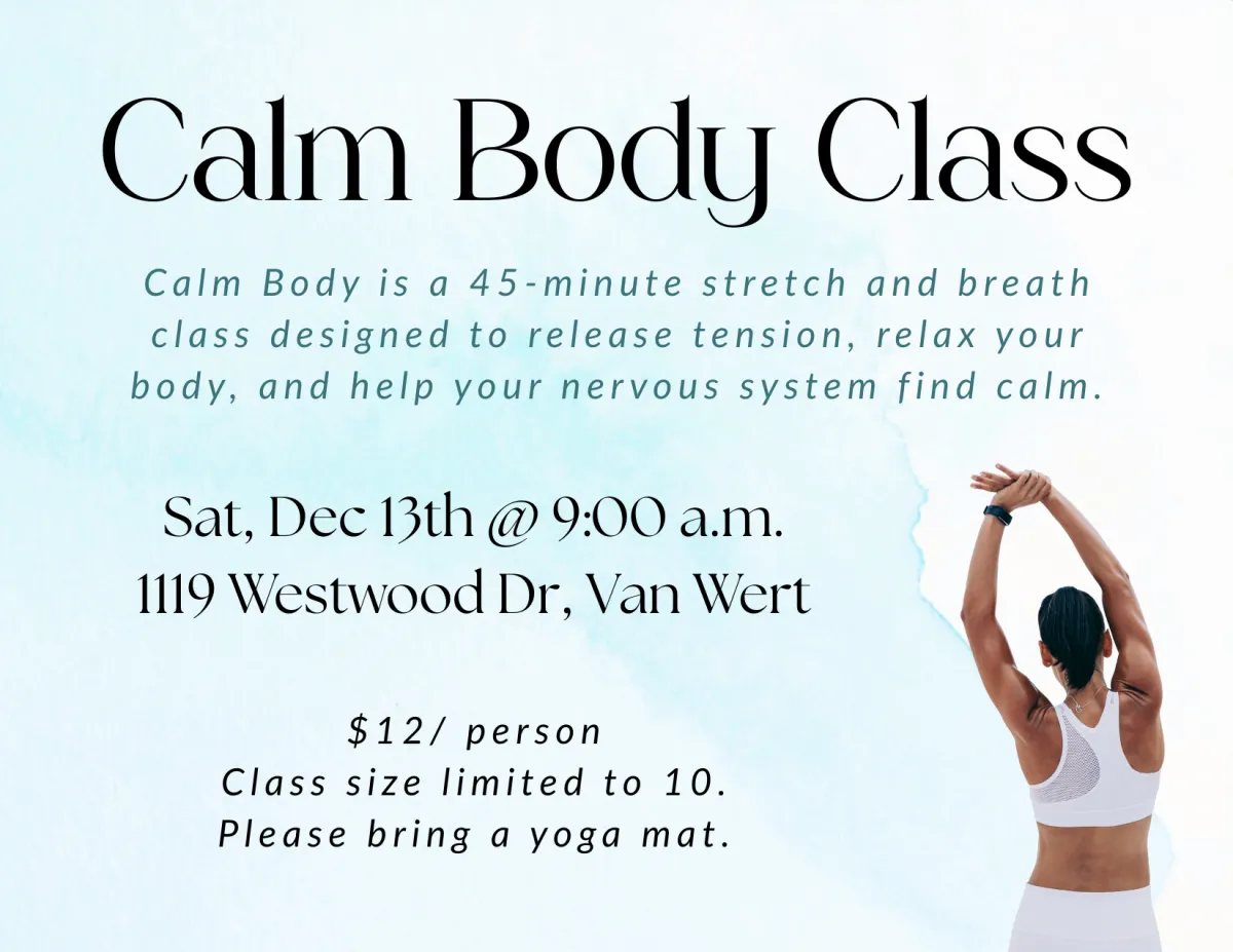 Calm Body is a 45-minute stretch and breath class designed to help you release tension and teach your body how to relax under pressure. Through gentle, guided stretches and slow, intentional breathing, you’ll learn to breathe through the tight spots—physically and emotionally—while signaling safety to your nervous system. You’ll leave feeling lighter, calmer, and more connected to yourself.